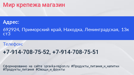 Мир крепежа, магазин по адресу 692924, Приморский край, Находка, Ленинградская, 13к ст3 в дальнейшем Организация, размещена в следующих категориях: