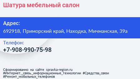 Шатура, мебельный салон по адресу 692918, Приморский край, Находка, Мичманская, 39а в дальнейшем Организация, размещена в следующих категориях: