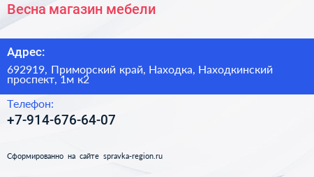 Весна, магазин мебели по адресу 692919, Приморский край, Находка, Находкинский проспект, 1м к2 в дальнейшем Организация, размещена в следующих категориях: