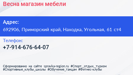 Весна, магазин мебели по адресу 692906, Приморский край, Находка, Угольная, 61 ст4 в дальнейшем Организация, размещена в следующих категориях:
