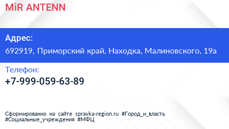 MiR ANTENN по адресу 692919, Приморский край, Находка, Малиновского, 19а в дальнейшем Организация, размещена в следующих категориях: