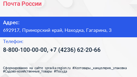 Почта России по адресу 692917, Приморский край, Находка, Гагарина, 3 в дальнейшем Организация, размещена в следующих категориях: