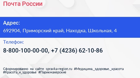 Почта России по адресу 692904, Приморский край, Находка, Школьная, 4 в дальнейшем Организация, размещена в следующих категориях:
