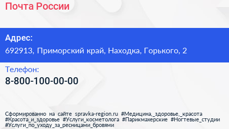 Почта России по адресу 692913, Приморский край, Находка, Горького, 2 в дальнейшем Организация, размещена в следующих категориях: