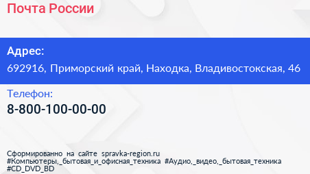 Почта России по адресу 692916, Приморский край, Находка, Владивостокская, 46 в дальнейшем Организация, размещена в следующих категориях: