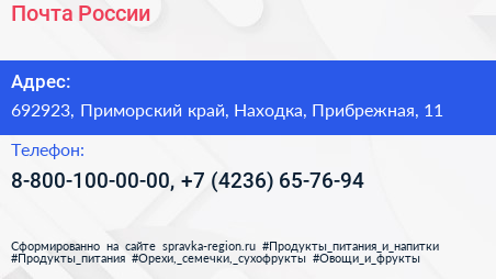 Почта России по адресу 692923, Приморский край, Находка, Прибрежная, 11 в дальнейшем Организация, размещена в следующих категориях: