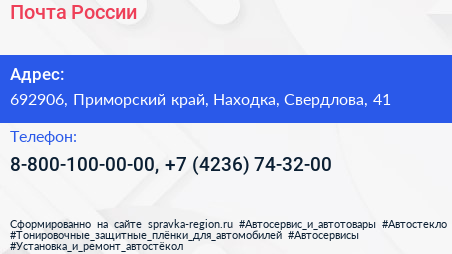 Почта России по адресу 692906, Приморский край, Находка, Свердлова, 41 в дальнейшем Организация, размещена в следующих категориях: