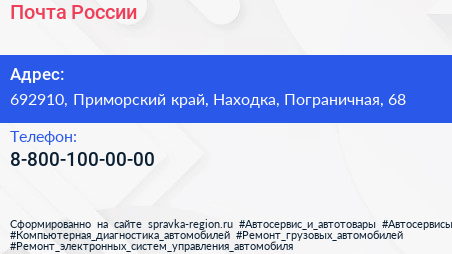 Почта России по адресу 692910, Приморский край, Находка, Пограничная, 68 в дальнейшем Организация, размещена в следующих категориях: