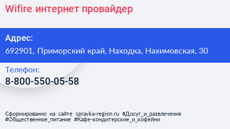 Wifire, интернет-провайдер по адресу 692901, Приморский край, Находка, Нахимовская, 30 в дальнейшем Организация, размещена в следующих категориях: