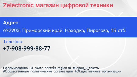 Zelectronic, магазин цифровой техники по адресу 692903, Приморский край, Находка, Пирогова, 1Б ст5 в дальнейшем Организация, размещена в следующих категориях: