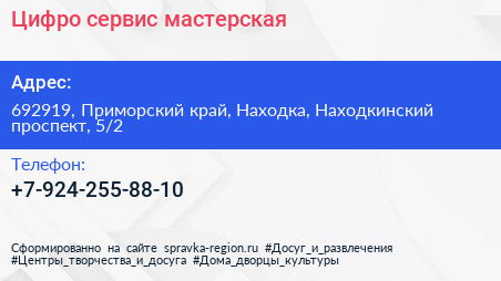 Цифро-сервис, мастерская по адресу 692919, Приморский край, Находка, Находкинский проспект, 5/2 в дальнейшем Организация, размещена в следующих категориях: