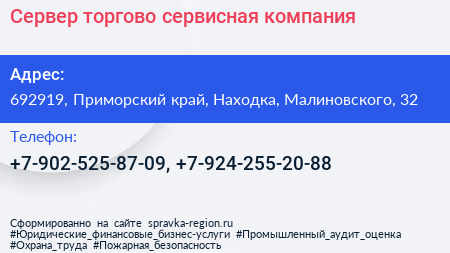 Сервер, торгово-сервисная компания по адресу 692919, Приморский край, Находка, Малиновского, 32 в дальнейшем Организация, размещена в следующих категориях:
