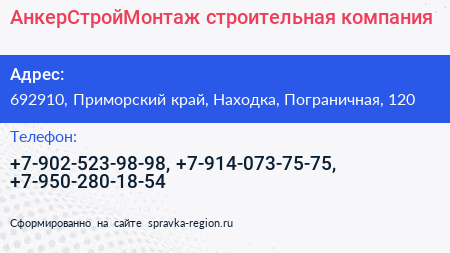 АнкерСтройМонтаж, строительная компания по адресу 692910, Приморский край, Находка, Пограничная, 120 в дальнейшем Организация, размещена в следующих категориях: