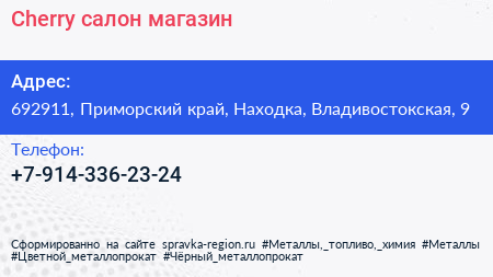 Cherry, салон-магазин по адресу 692911, Приморский край, Находка, Владивостокская, 9 в дальнейшем Организация, размещена в следующих категориях:
