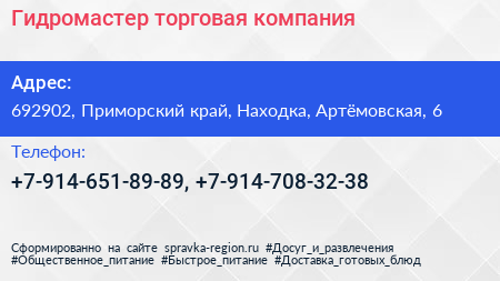 Гидромастер, торговая компания по адресу 692902, Приморский край, Находка, Артёмовская, 6 в дальнейшем Организация, размещена в следующих категориях: