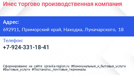 Инес, торгово-производственная компания по адресу 692911, Приморский край, Находка, Луначарского, 18 в дальнейшем Организация, размещена в следующих категориях: