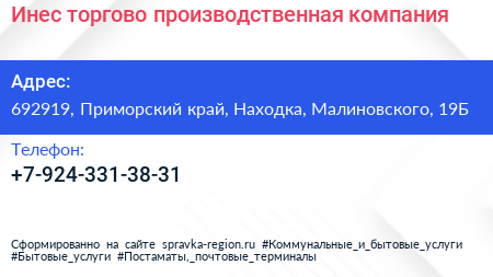 Инес, торгово-производственная компания по адресу 692919, Приморский край, Находка, Малиновского, 19Б в дальнейшем Организация, размещена в следующих категориях: