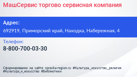 МашСервис, торгово-сервисная компания по адресу 692919, Приморский край, Находка, Набережная, 4 в дальнейшем Организация, размещена в следующих категориях: