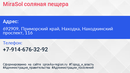 MiraSol`, соляная пещера по адресу 692909, Приморский край, Находка, Находкинский проспект, 116 в дальнейшем Организация, размещена в следующих категориях: