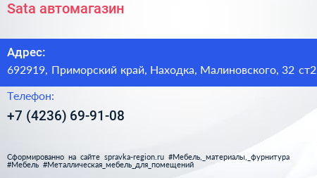 Sata, автомагазин по адресу 692919, Приморский край, Находка, Малиновского, 32 ст2 в дальнейшем Организация, размещена в следующих категориях: