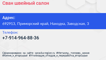 Сван, швейный салон по адресу 692913, Приморский край, Находка, Заводская, 3 в дальнейшем Организация, размещена в следующих категориях: