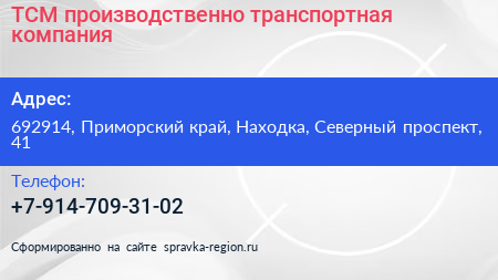 ТСМ, производственно-транспортная компания по адресу 692914, Приморский край, Находка, Северный проспект, 41 в дальнейшем Организация, размещена в следующих категориях: