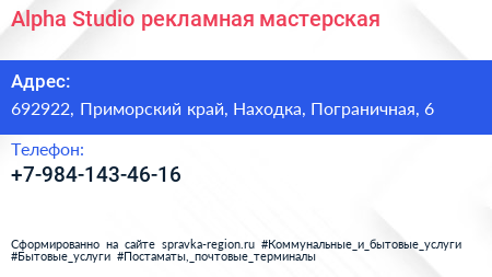 Alpha Studio, рекламная мастерская по адресу 692922, Приморский край, Находка, Пограничная, 6 в дальнейшем Организация, размещена в следующих категориях: