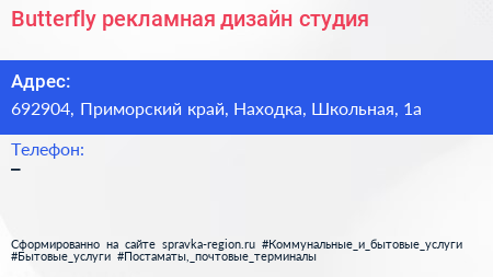 Butterfly, рекламная дизайн-студия по адресу 692904, Приморский край, Находка, Школьная, 1а в дальнейшем Организация, размещена в следующих категориях: