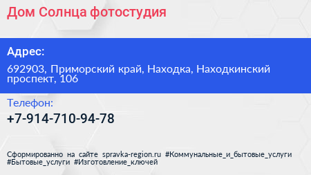 Дом Солнца, фотостудия по адресу 692903, Приморский край, Находка, Находкинский проспект, 106 в дальнейшем Организация, размещена в следующих категориях: