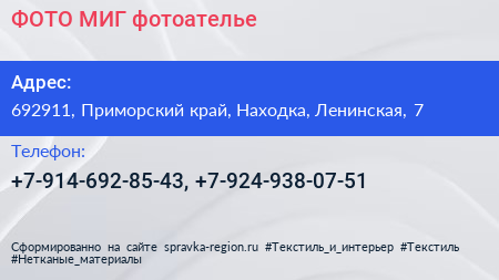 ФОТО-МИГ, фотоателье по адресу 692911, Приморский край, Находка, Ленинская, 7 в дальнейшем Организация, размещена в следующих категориях: