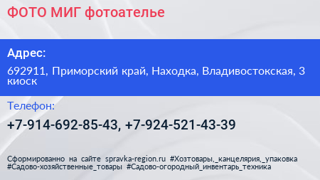 ФОТО-МИГ, фотоателье по адресу 692911, Приморский край, Находка, Владивостокская, 3 киоск в дальнейшем Организация, размещена в следующих категориях: