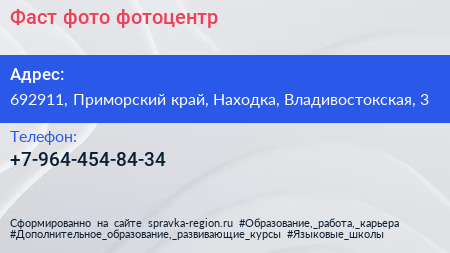 Фаст-фото, фотоцентр по адресу 692911, Приморский край, Находка, Владивостокская, 3 в дальнейшем Организация, размещена в следующих категориях: