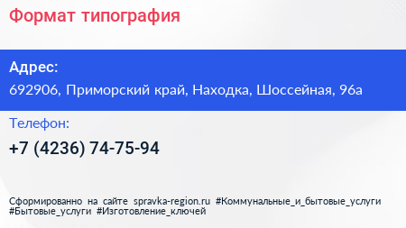 Формат, типография по адресу 692906, Приморский край, Находка, Шоссейная, 96а в дальнейшем Организация, размещена в следующих категориях: