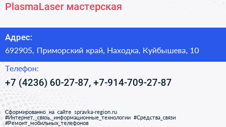 PlasmaLaser, мастерская по адресу 692905, Приморский край, Находка, Куйбышева, 10 в дальнейшем Организация, размещена в следующих категориях: