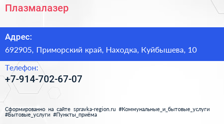Плазмалазер по адресу 692905, Приморский край, Находка, Куйбышева, 10 в дальнейшем Организация, размещена в следующих категориях: