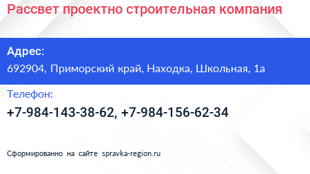 Рассвет, проектно-строительная компания по адресу 692904, Приморский край, Находка, Школьная, 1а в дальнейшем Организация, размещена в следующих категориях: