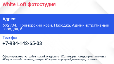 White Loft, фотостудия по адресу 692904, Приморский край, Находка, Административный городок, 6 в дальнейшем Организация, размещена в следующих категориях: