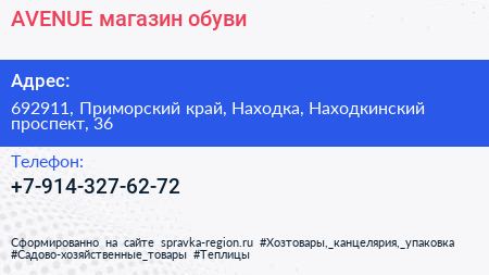 AVENUE, магазин обуви по адресу 692911, Приморский край, Находка, Находкинский проспект, 36 в дальнейшем Организация, размещена в следующих категориях: