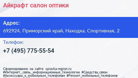 Айкрафт, салон оптики по адресу 692924, Приморский край, Находка, Спортивная, 2 в дальнейшем Организация, размещена в следующих категориях: