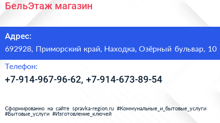 БельЭтаж, магазин по адресу 692928, Приморский край, Находка, Озёрный бульвар, 10 в дальнейшем Организация, размещена в следующих категориях: