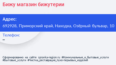 Бижу, магазин бижутерии по адресу 692928, Приморский край, Находка, Озёрный бульвар, 10 в дальнейшем Организация, размещена в следующих категориях: