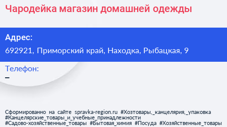 Чародейка, магазин домашней одежды по адресу 692921, Приморский край, Находка, Рыбацкая, 9 в дальнейшем Организация, размещена в следующих категориях:
