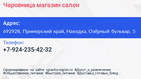 Чаровница, магазин-салон по адресу 692928, Приморский край, Находка, Озёрный бульвар, 5 в дальнейшем Организация, размещена в следующих категориях:
