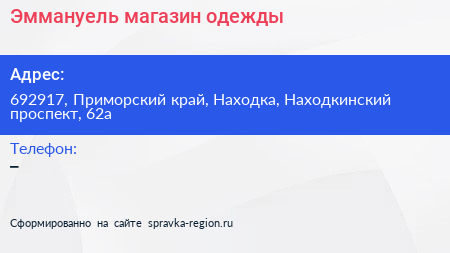 Эммануель, магазин одежды по адресу 692917, Приморский край, Находка, Находкинский проспект, 62а в дальнейшем Организация, размещена в следующих категориях: