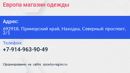 Европа, магазин одежды по адресу 692918, Приморский край, Находка, Северный проспект, 2/1 в дальнейшем Организация, размещена в следующих категориях: