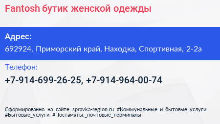 Fantosh, бутик женской одежды по адресу 692924, Приморский край, Находка, Спортивная, 2-2а в дальнейшем Организация, размещена в следующих категориях: