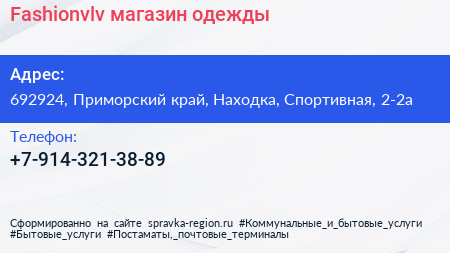 Fashionvlv, магазин одежды по адресу 692924, Приморский край, Находка, Спортивная, 2-2а в дальнейшем Организация, размещена в следующих категориях:
