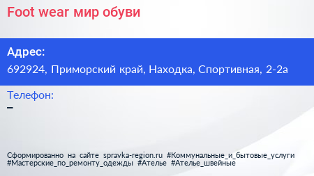 Foot wear, мир обуви по адресу 692924, Приморский край, Находка, Спортивная, 2-2а в дальнейшем Организация, размещена в следующих категориях: