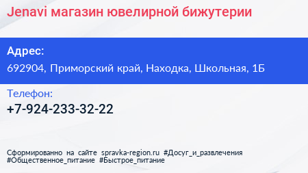 Jenavi, магазин ювелирной бижутерии по адресу 692904, Приморский край, Находка, Школьная, 1Б в дальнейшем Организация, размещена в следующих категориях: