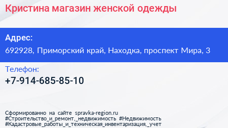 Кристина, магазин женской одежды по адресу 692928, Приморский край, Находка, проспект Мира, 3 в дальнейшем Организация, размещена в следующих категориях: